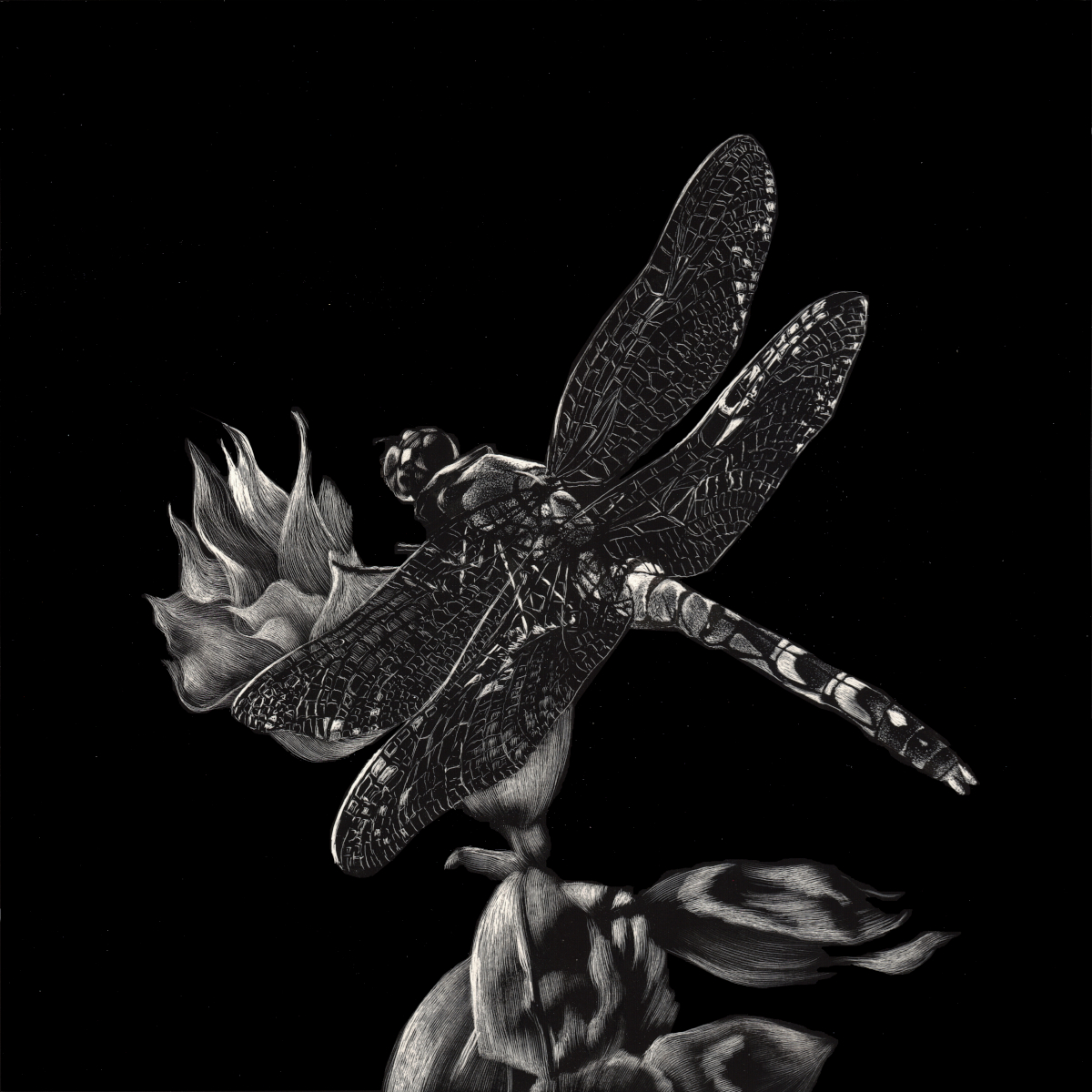 An Instant ~ Enough is an original artwork by Lindsey Kiser completed in scratchboard. Living on three acres with two ponds has its perks. Inspiration is ever present. Lindsey encountered this green darner in her front yard. Sh was fortunate enough to have her camera ready. Over the winter, she was able to contemplate the instant with many to follow spent bent over her scratchboard slowly engraving the image.