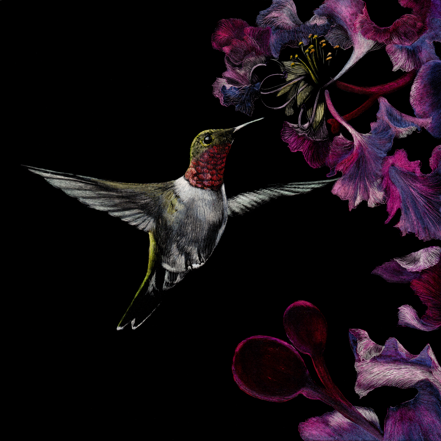 Stillness in Motion is an original artwork by Lindsey Kiser completed in scratchboard with colorful ink and iridescent watercolor. Living on three acres with two ponds and a pollinator garden, inspiration is ever present. Lindsey and her husband, Jeff, refill the hummingbird feeder two to three times per day by September. She photographed hundreds of hummingbirds at the feeder and visiting her crape myrtle blossoms. Over the winter, she selected and edited her favorite photographs or hummingbirds and blossoms from her garden to compose this scene.